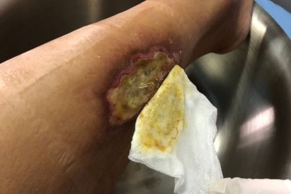 Ảnh: Dấu hiệu nhiễm trùng dưới băng gạc như mủ, mùi hôi, đỏ lan rộng,...